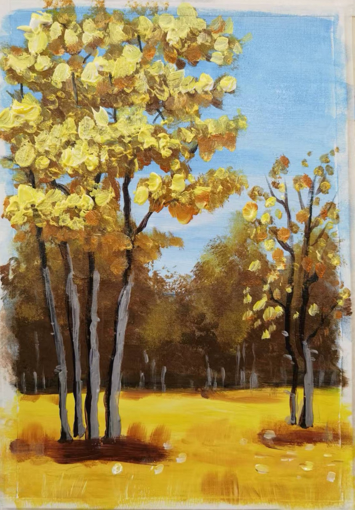 首句“穹澈杏金黄” 以天光树色营造视觉奇观。诗人巧妙运用“杏金黄”这一暖色调,将透过林隙的天光描绘得既具物质质感又含温度感,仿佛树冠缺口处倾泻着融化的琥珀。这种光色描写令人想起印象派画家对光线的痴迷追求。